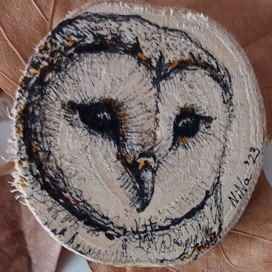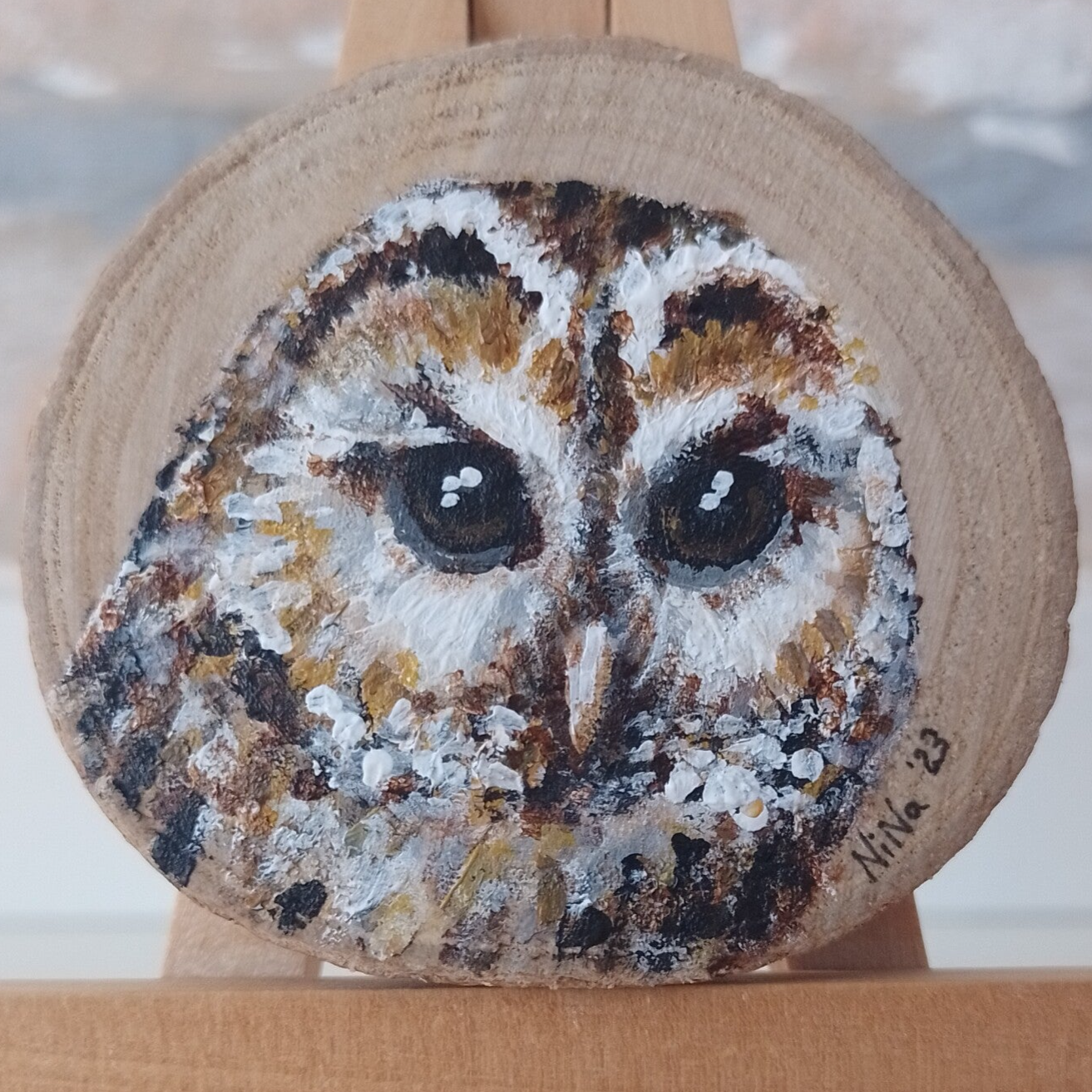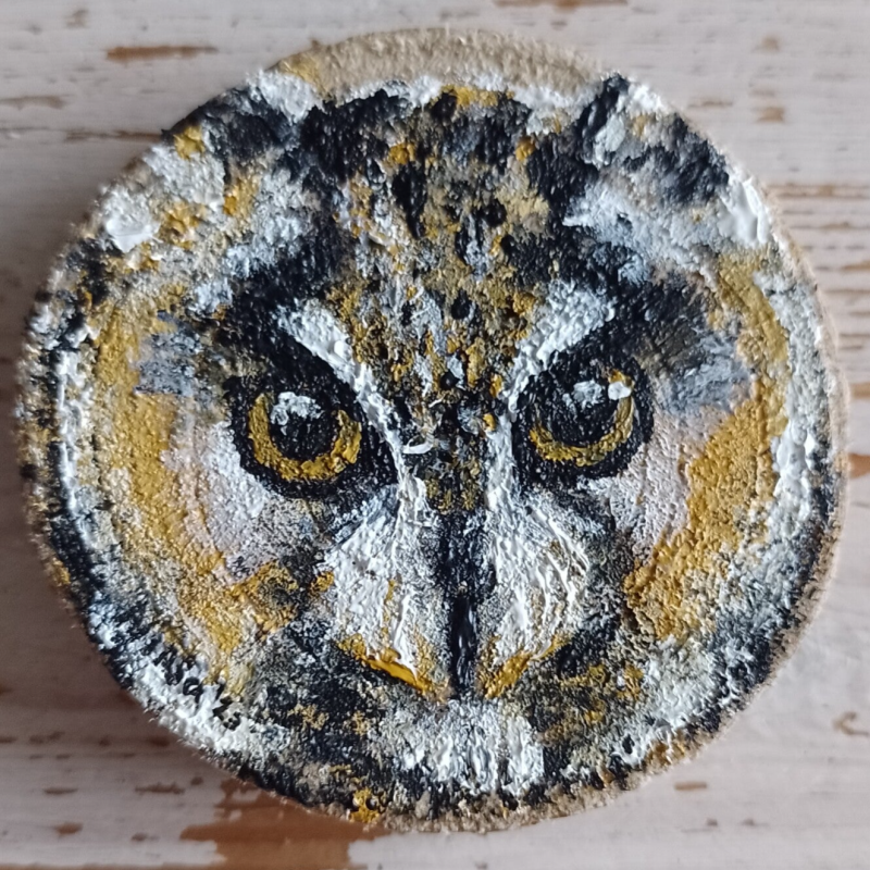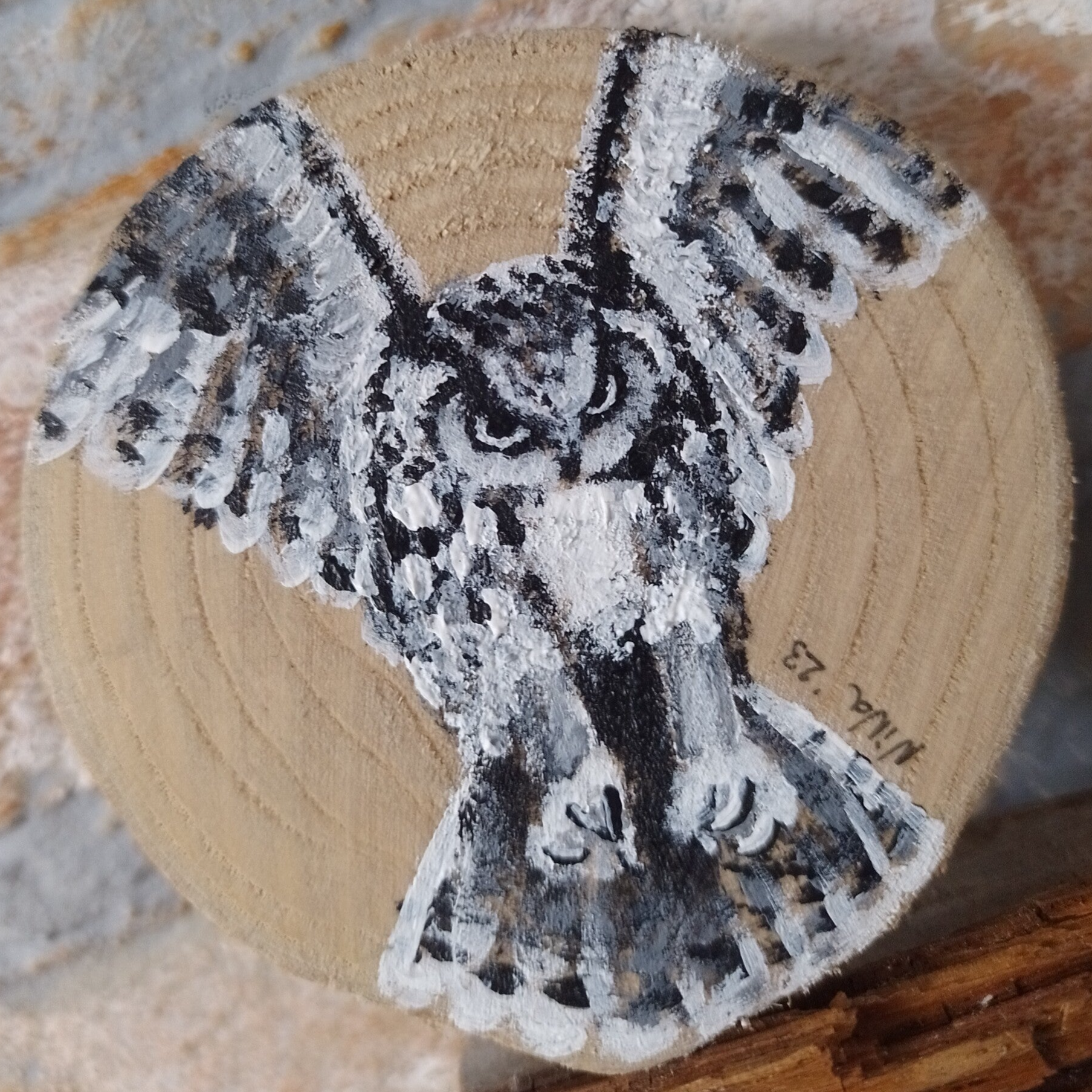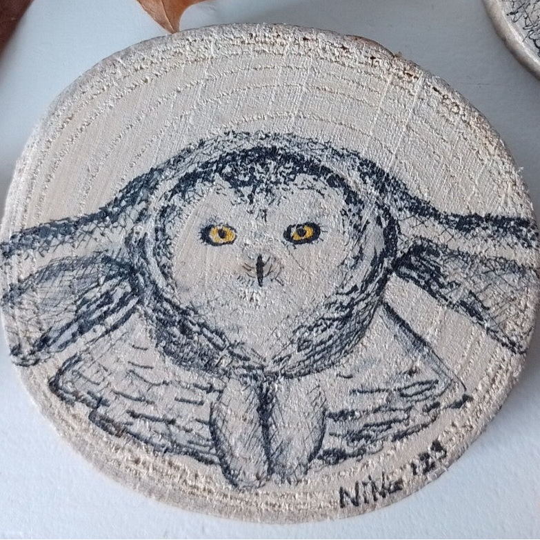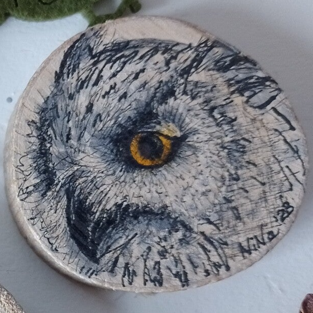 Miniatuur uiltjes, pen/brushpen op houten schijfje, Ø ca 5-7cm
