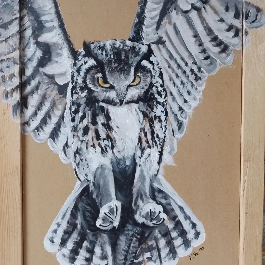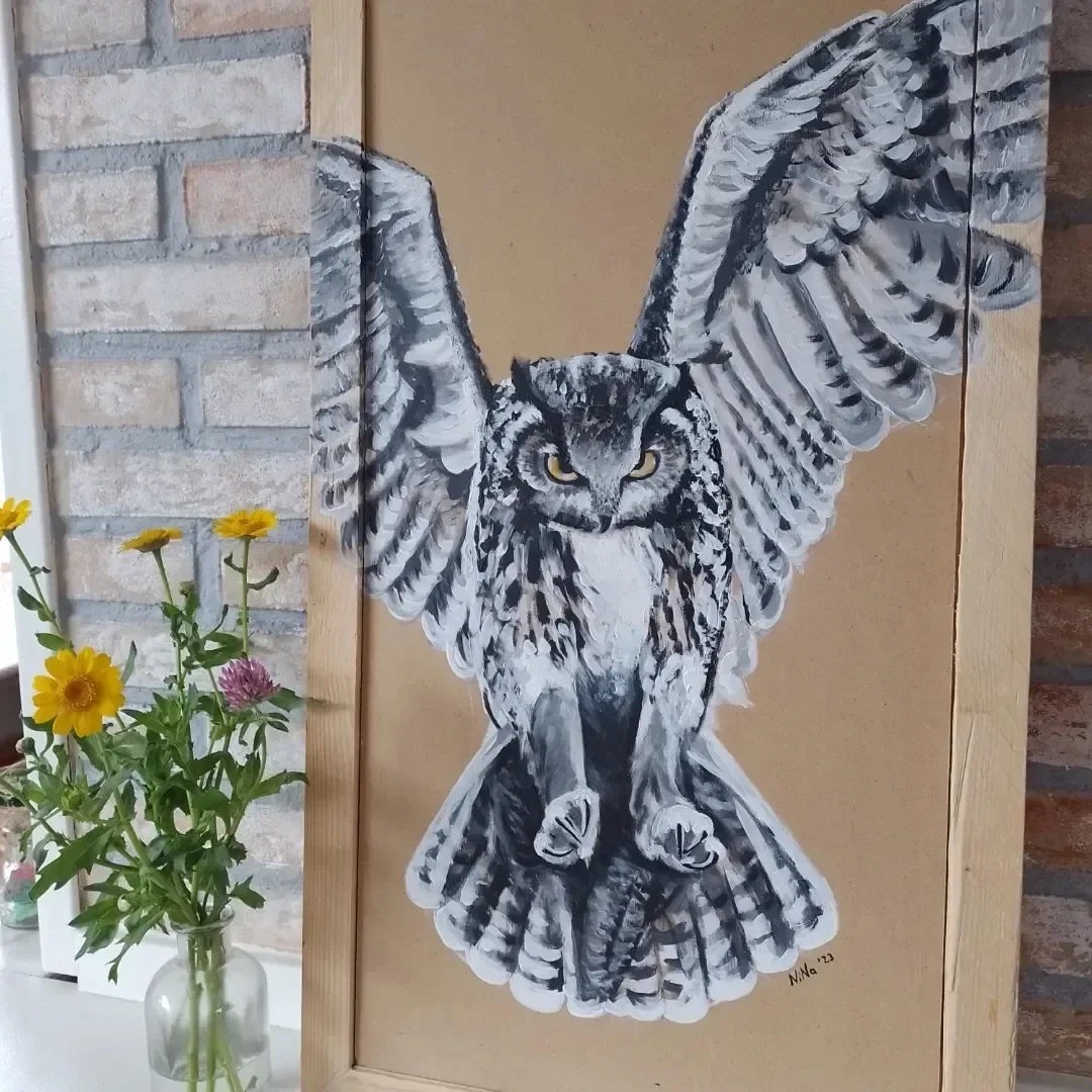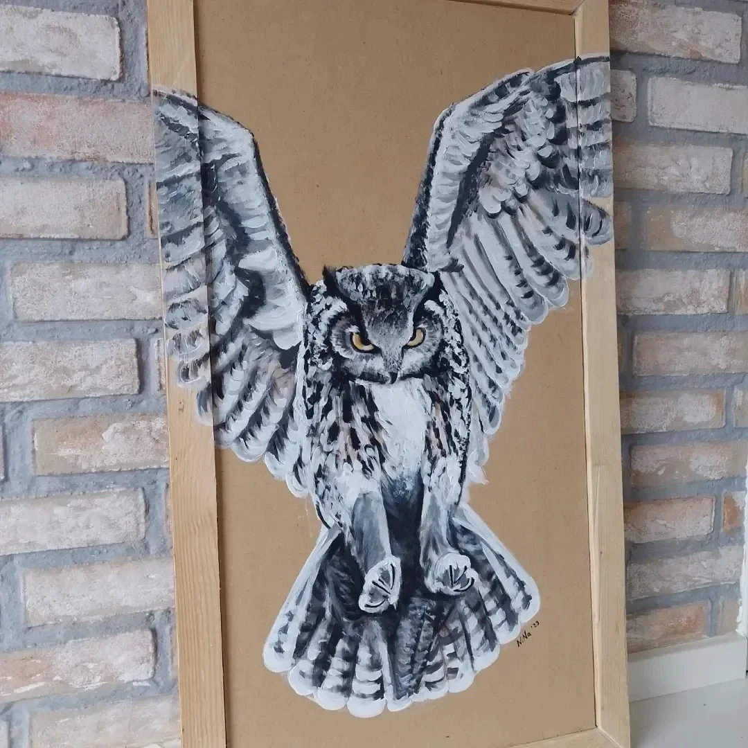 Handgeschilderd uniek schilderij, ' Oehoe', acryl op mdf met handgemaakte lijst van resthout, formaat 40x70cm